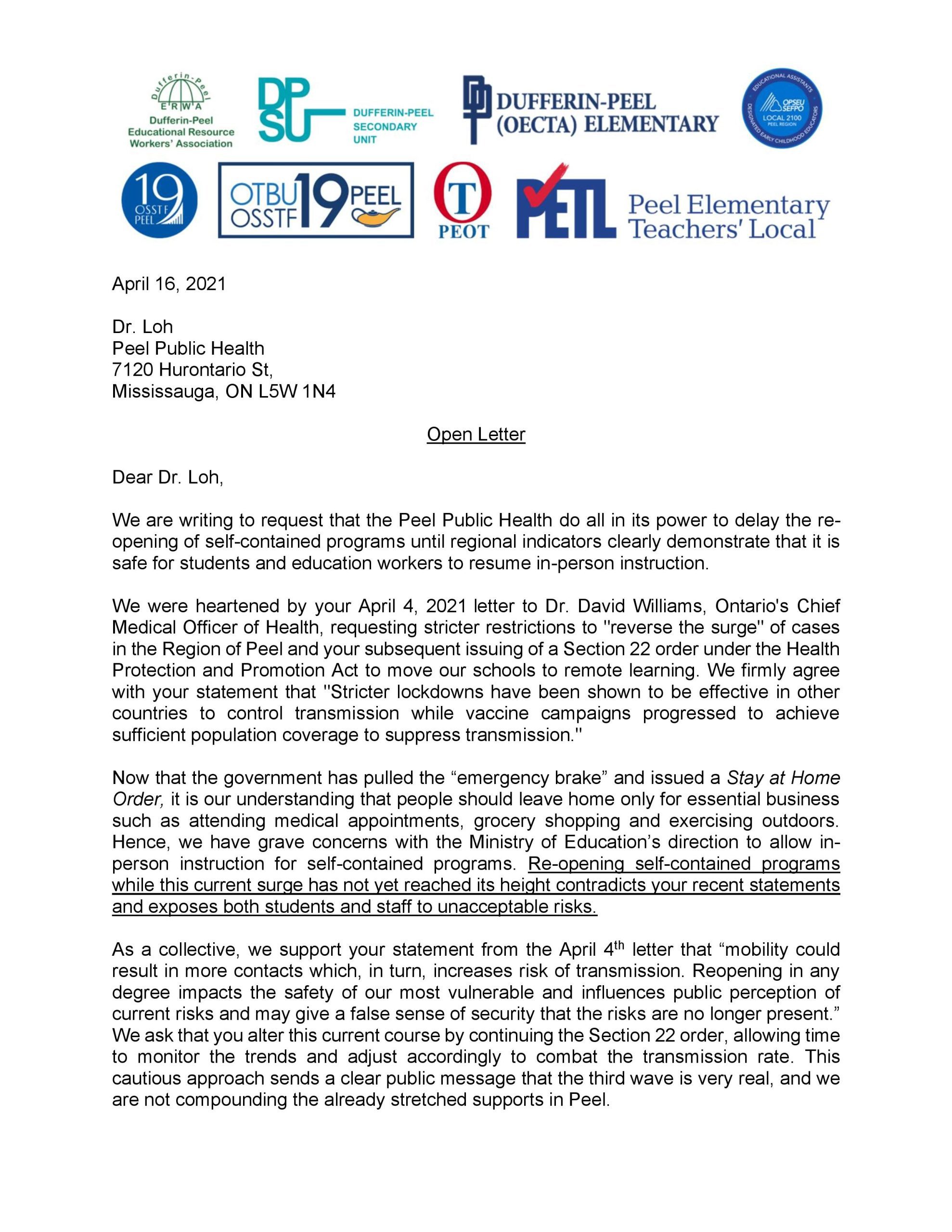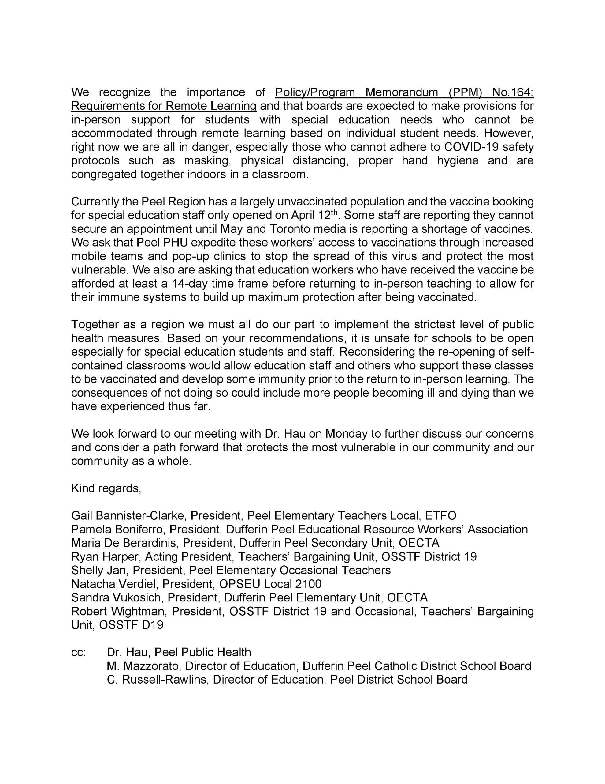 Group Letter from Peel Education Unions