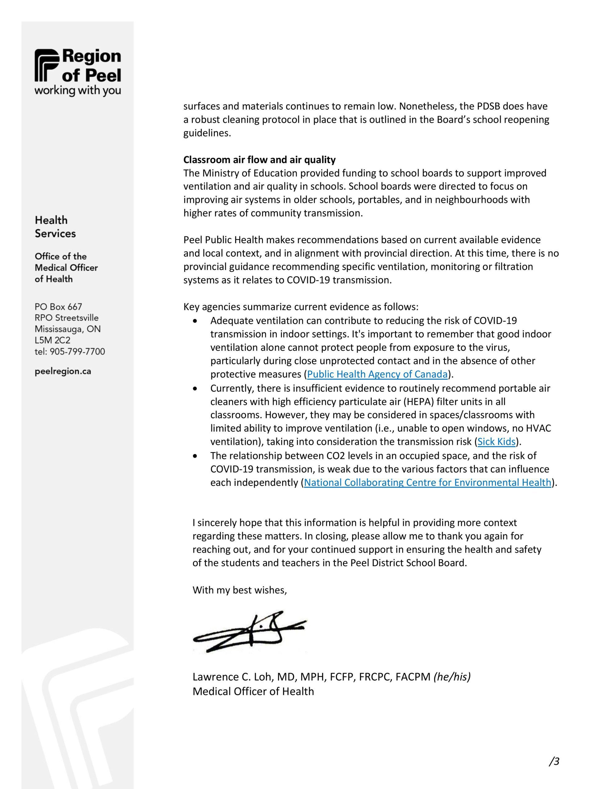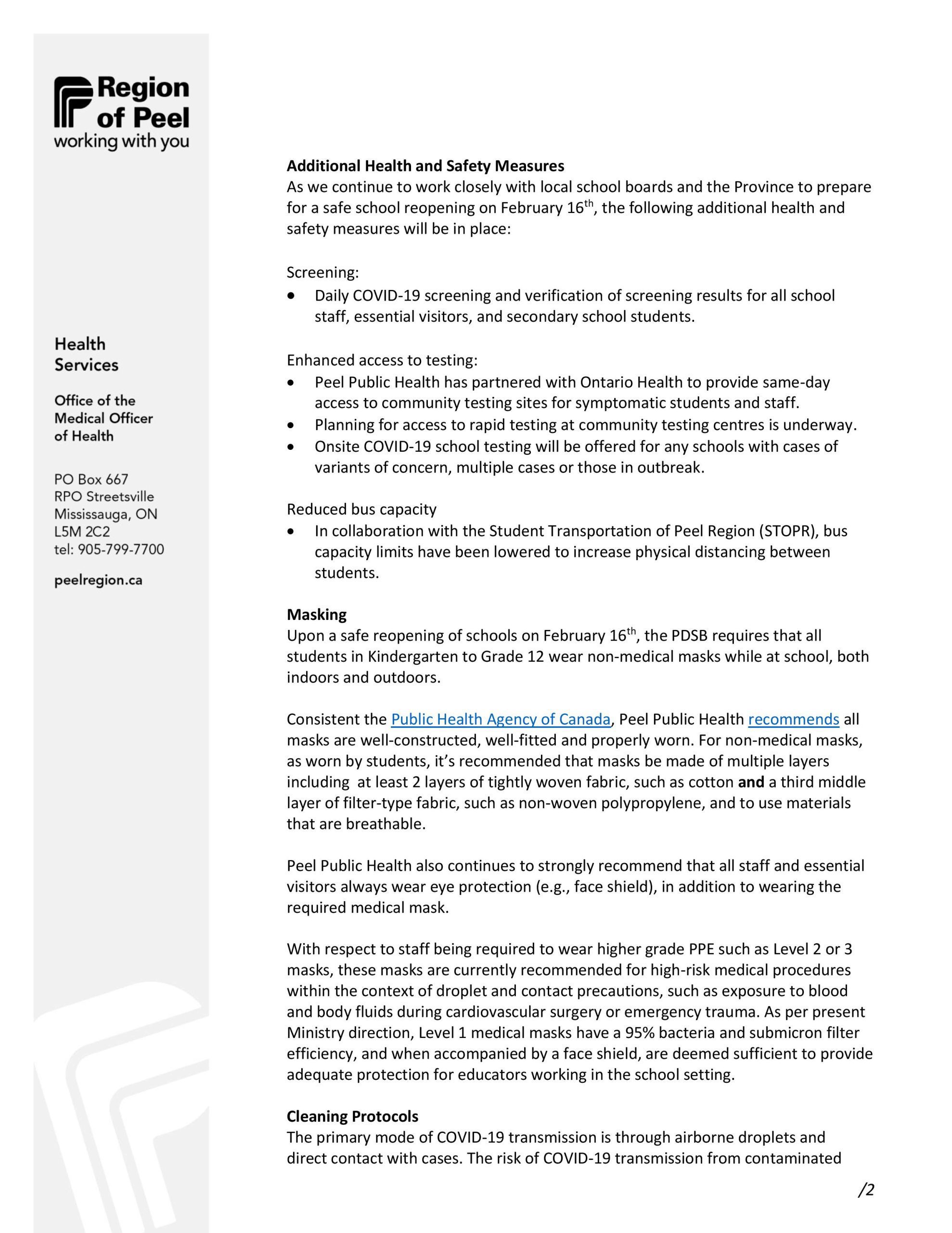 Home / Letter to Dr. Loh, Medical Officer of Health, Region of Peel RE: Re-Opening of Schools in February and Response