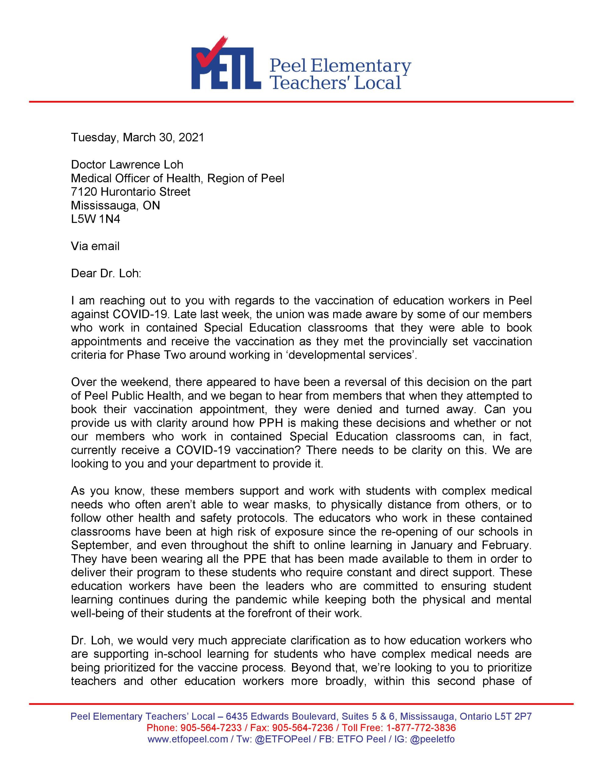 Letter to Dr. Loh regarding vaccinations